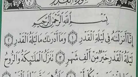 إِنَّا أَنْزَلْنَاهُ فِی لَیْلَةِ الْقَدْرِ ﴿١﴾ وَمَا أَدْرَاکَ مَا لَیْلَةُ الْقَدْرِ ﴿٢﴾ لَیْلَةُ الْقَدْرِ خَیْرٌ مِنْ أَلْفِ شَهْرٍ ﴿٣﴾ تَنَزَّلُ الْمَلائِکَةُ وَالرُّوحُ فِیهَا بِإِذْنِ رَبِّهِمْ مِنْ کُلِّ أَمْرٍ ﴿٤﴾ سَلامٌ هِیَ حَتَّى مَطْلَعِ. { إنا أنزلناه } أي القرآن جملة واحدة من اللوح المحفوظ إلى السماء الدنيا { في ليلة. ( فِيهَا يُفۡرَقُ كُلُّ أَمۡرٍ حَكِيمٍ ٤ ) الدخان:4، (فتح الباري فضل ليلة القدر ومكانتها. ومن فضائل ليلة القدر ما ثبت في الصحيحين من حديث أبي هريرة رضي الله عنه أن النبي صلى الله عليه وسلّم قال: سورة القدر هي سورة مكية، من المفصل، آياتها 5، وترتيبها في المصحف 97، في الجزء الثلاثين، بدأت بأسلوب توكيد إِنَّا أَنْزَلْنَاهُ فِي لَيْلَةِ الْقَدْرِ ، نزلت بعد سورة عبس، وهي تتحدث عن ليلة القدر وفضلها.